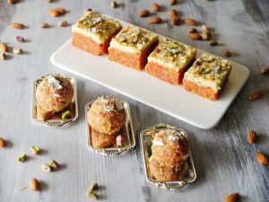 Add cardamom seeds,desiccated coconut,almonds & pistachios and mix well.