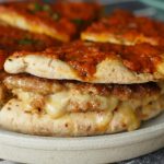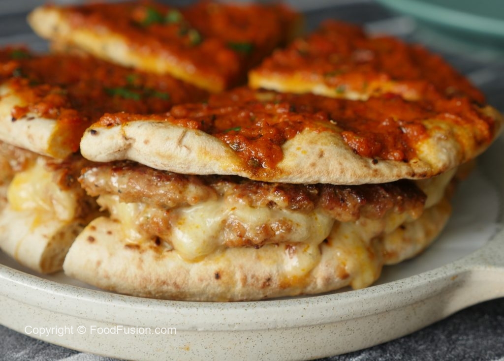 Mozzarella cheese,cheddar cheese,paprika powder,pyaz slices,tamatar,hara dhania aur lemon juice dal dein aur upper sa ek aur kabab rakh ker evenly pheela lein phir flat surface per flip ker lein (makes 2).