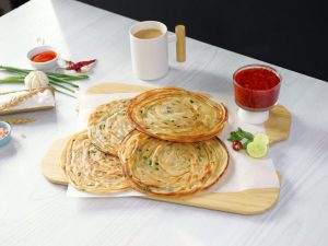 -Ghee dal ker pheela lein,dry flour sprinkle karen,phir strips cut karen,hara pyaz leaves sprinkle karen aur 4 strips ko swiss roll ki tarah roll karen (beech beech mein stretch karen).