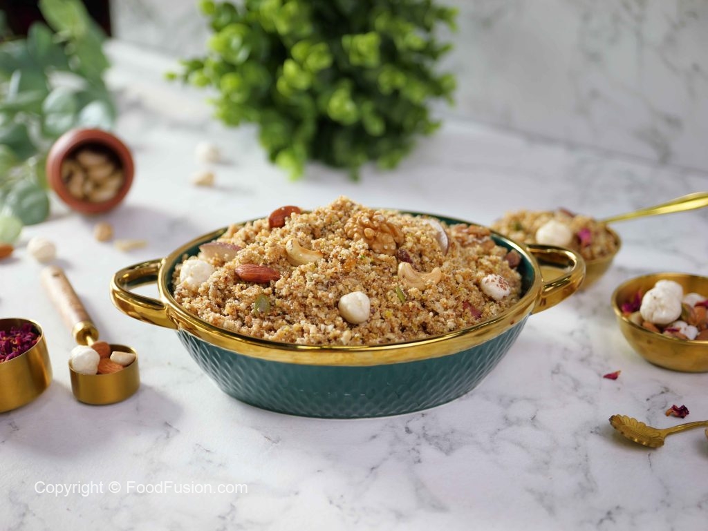 -Phir se ghee melt karein aur almonds, pistachios, cashews, walnuts aur dried coconut add karke low flame par 3-4 minutes fry karein.
