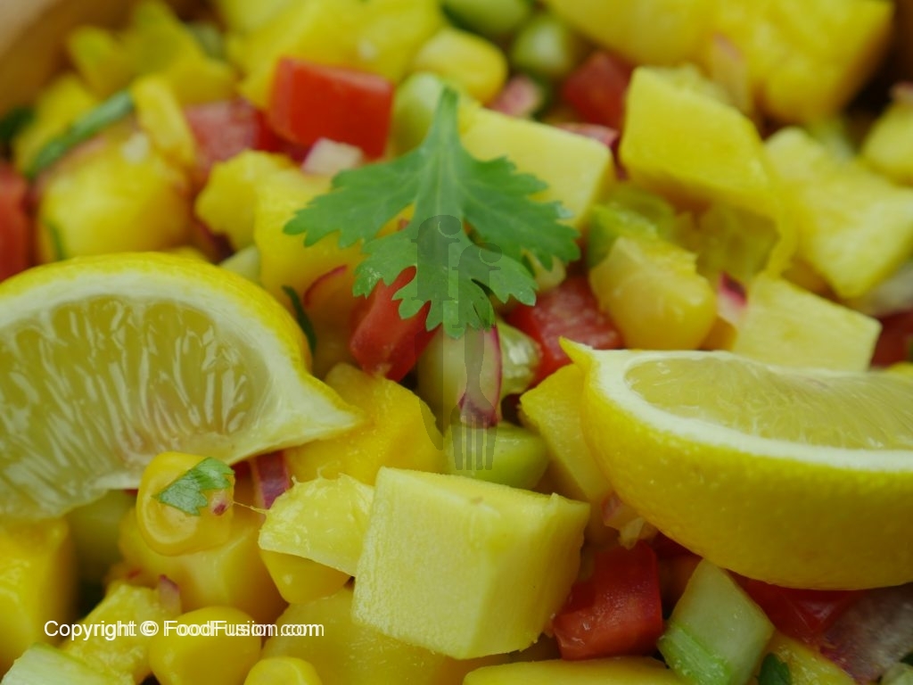 In bowl add mango cubes, cucumber cubes and tomato cubes, corn boiled and coriander leaves.