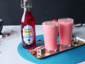 -In a serving glass,add ice cubes,milk,lal sharbat & stir.