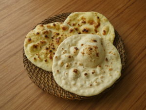 Knead dough again,grease hands with oil,take a dough and make a ball,sprinkle flour on working surface and roll out dough with the help of rolling pin and apply water on the surface (makes 4-5 Naans).