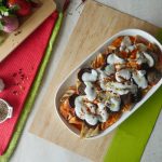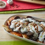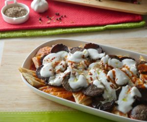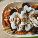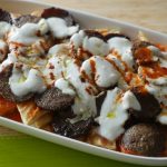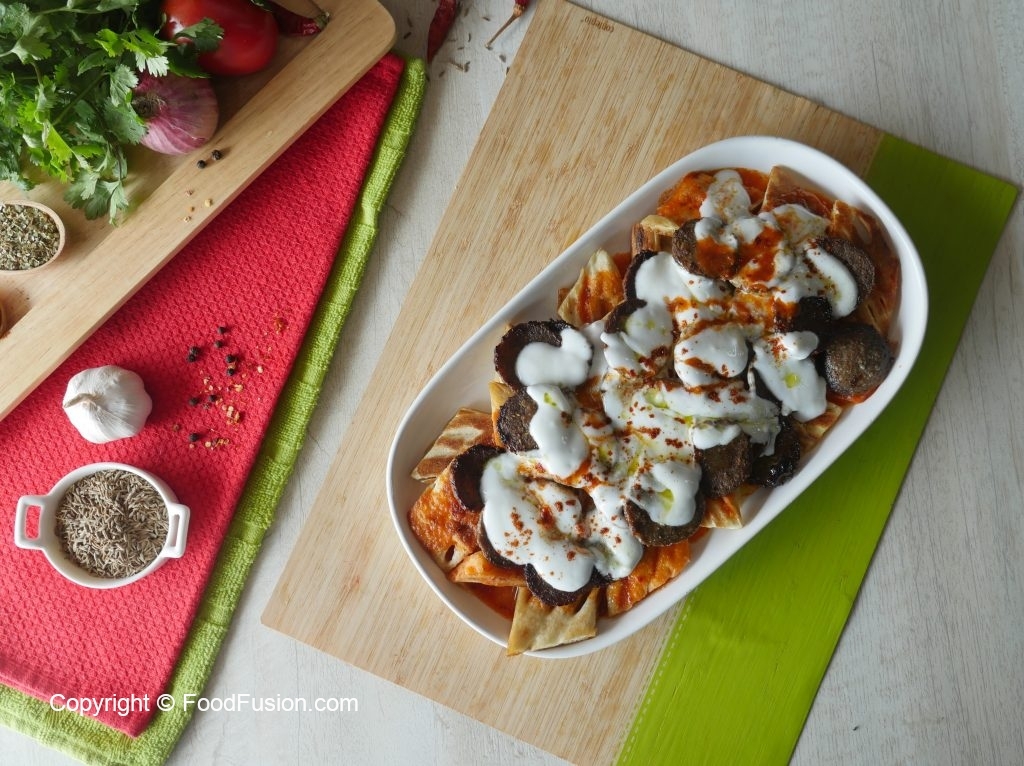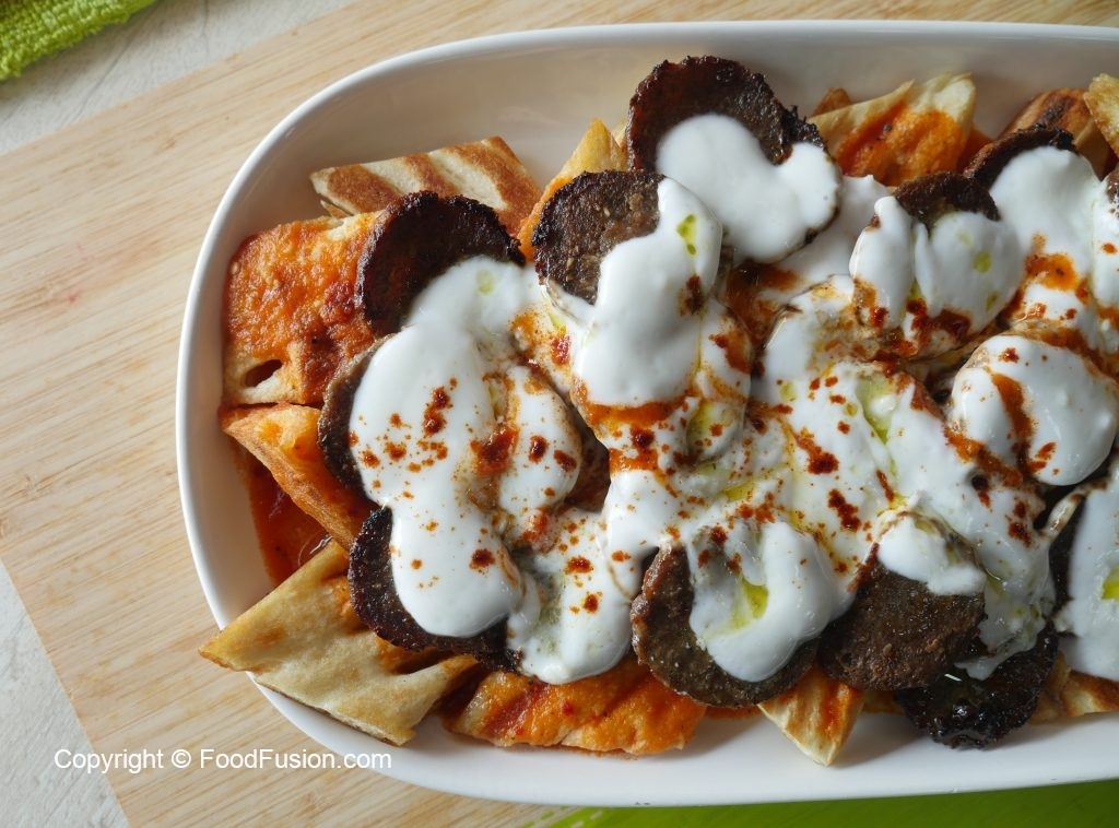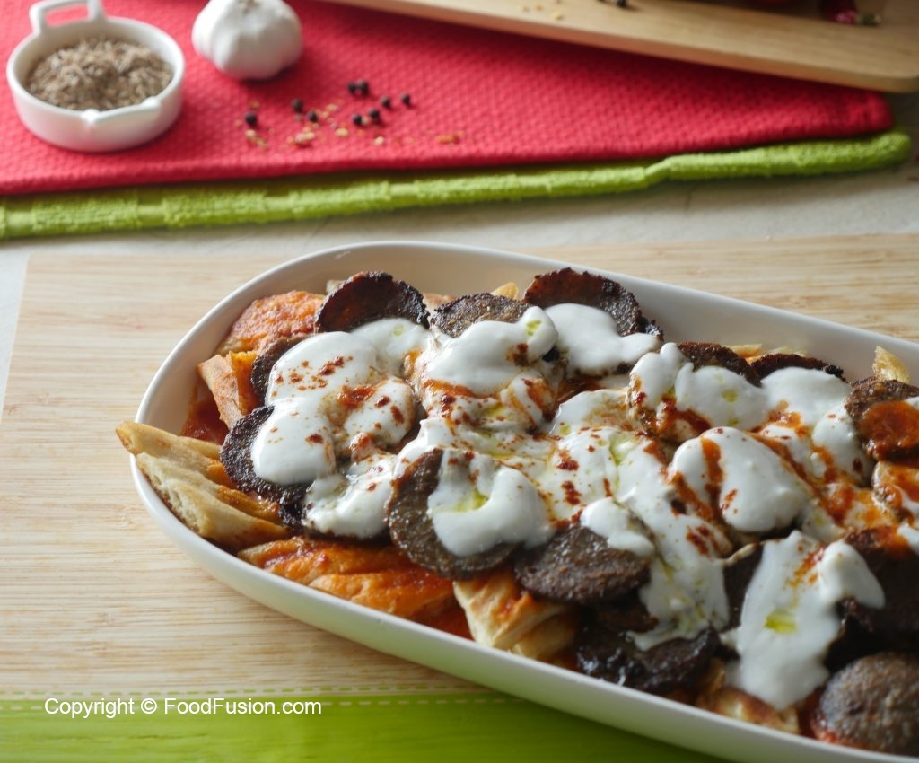 On a serving plate,add naan pieces,prepared tomato sauce,iskandar kabab slices,garlic yogurt sauce