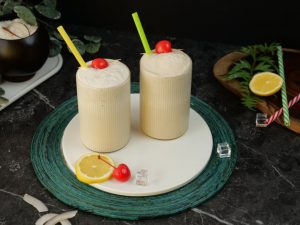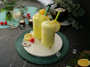 -In a shaker,add crushed ice,prepared lemon sugar syrup (3-4 tbs),coconut milk,close the lid and shake well.