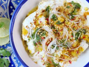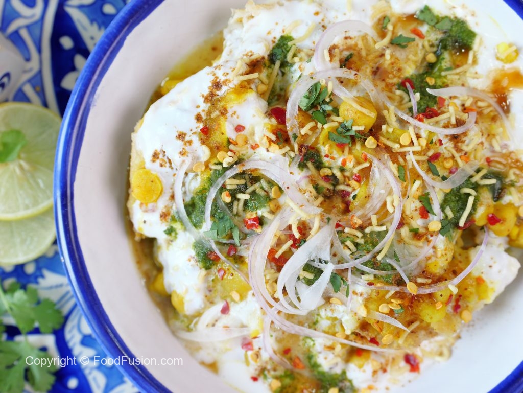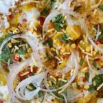 -On serving dish,break kachoris,add prepared tarkari,yogurt,chaat masala,green chutney,imli ki meethi chutney,onion,red chilli crushed,nimco sev,fresh coriander & serve!