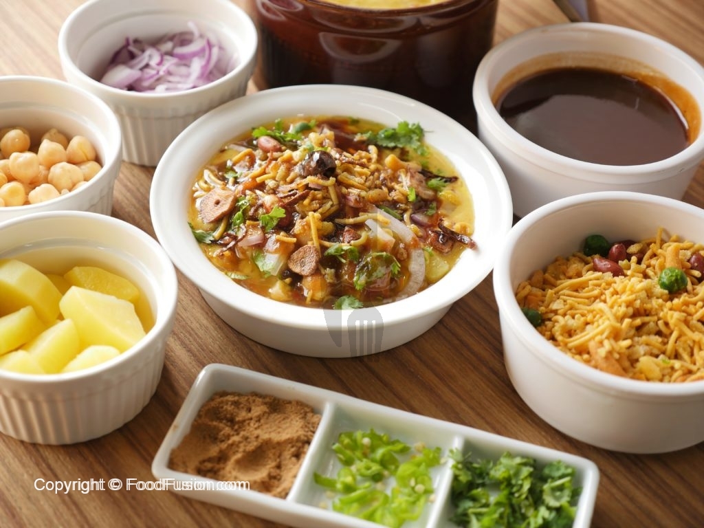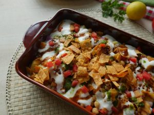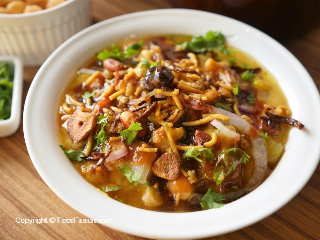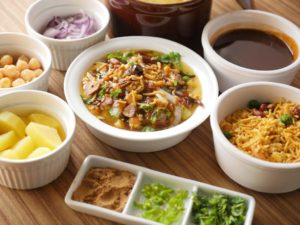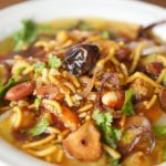 In serving plate,add chickpeas,potatoes,chaat masala,kadhi,khatti meethi chutney,onion,lemon juice, fresh coriander,green chilies,chaat masala,mix nimco,khatti meethi chutney & serve.