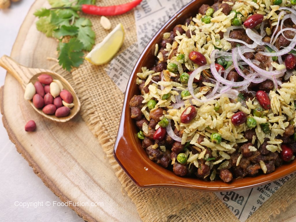 -In a serving dish,add cooked kalay chanay,chaat masala,fresh coriander,onion,prepared matar chewra & serve!