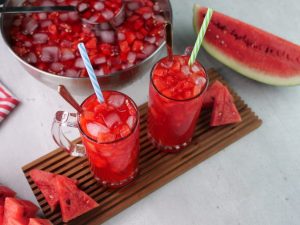 -In a bowl,add ice cubes,water melon (cut in small cubes) & mix well.