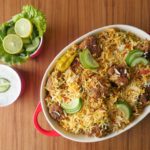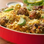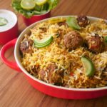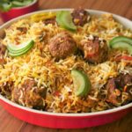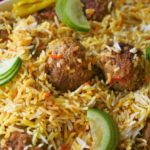 Add fried meat balls/koftay,mint leaves,coriander,green chilies,boiled rice,lemon juice,mint leaves, mcoriander,potato,green chiliesa and yellow food color,cover and cook for 15-20 minutes on low flame.
