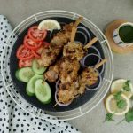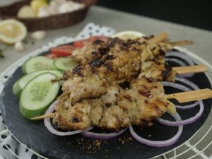 Thread marinated chicken into wooden skewers (makes 9-10).