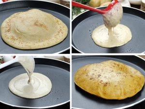 Pour prepared batter with the help of ladle & spread evenly,cook on low flame until it changes color then flip and apply oil/ghee in between (makes 6).