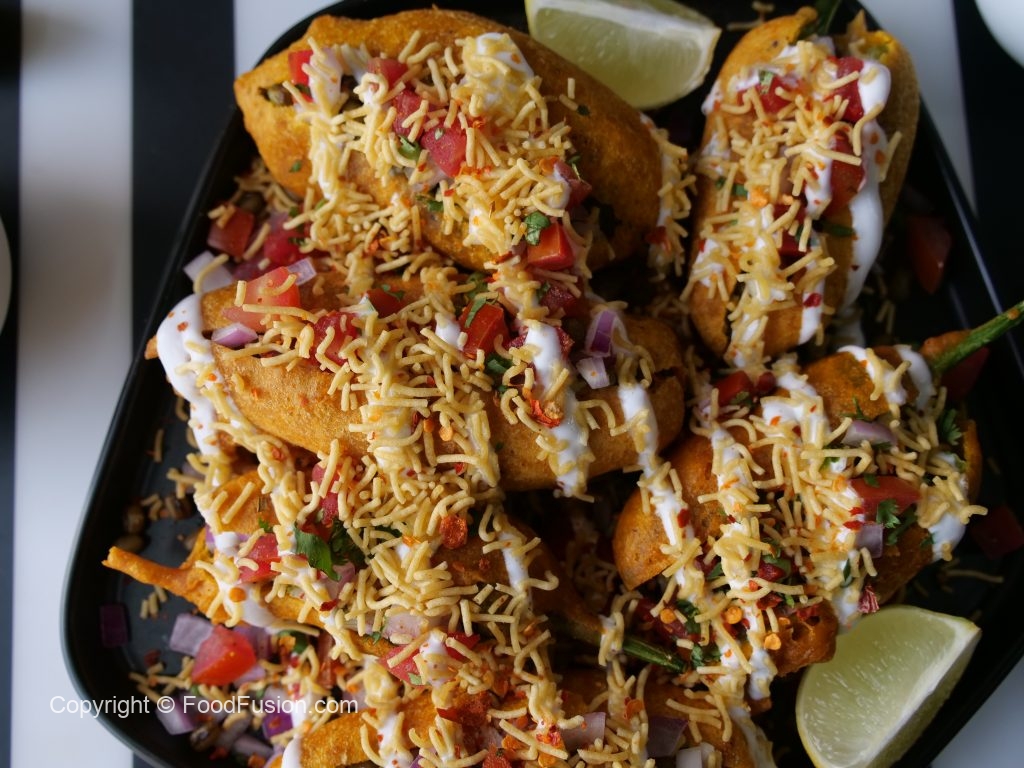 -Cut mirchi pakora from center and place them on a serving plate. Add green lentil gram in it.