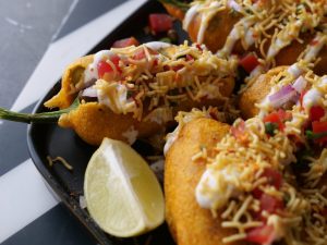 -Ab pyaz, tamatar, hara dhania, chaat masala, dahi, nimco sev or lal mirch crushed upar se charak kar serve karen!