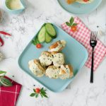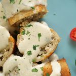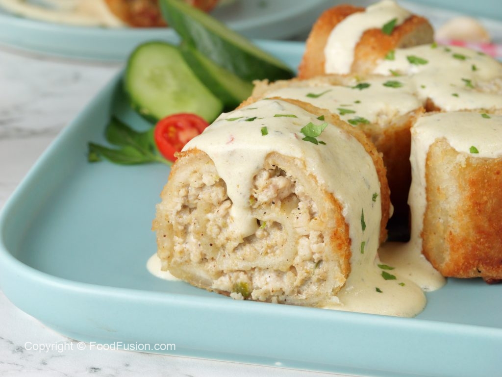-Cut prepared malai chicken roll ups & drizzle prepared creamy sauce,sprinkle fresh coriander & serve (makes 4-5).