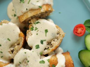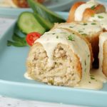 -Tayyar prepared malai chicken roll ups ko cut ker lein,tayyar creamy sauce aur hara dhania dal ker serve karein (makes 4-5).