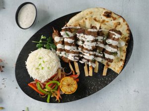 -Thread marinated mutton boti in wooden skewers.