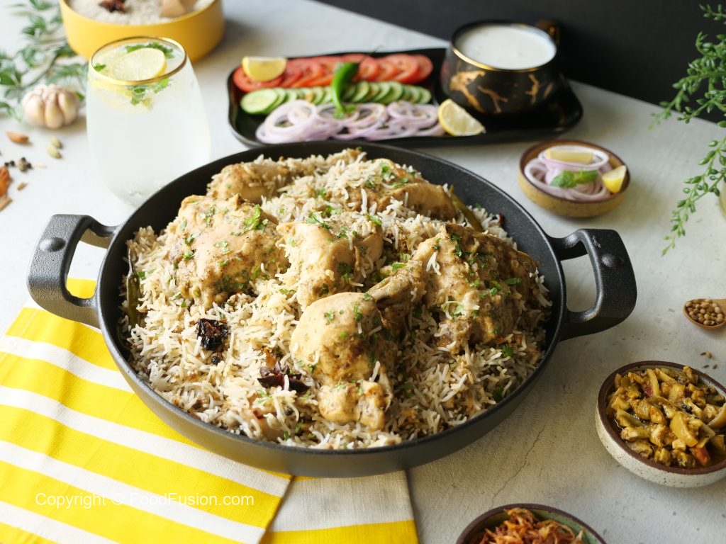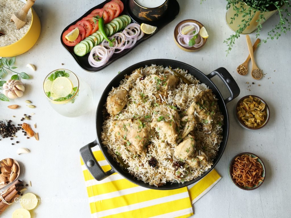 -Remaining gravy mein podina,hara dhania,fried pyaz,boiled chawal ki half quantity,reserved gravy, podina,hara dhania,fried pyaz,remaining chawal,fried pyaz aur steam cooked chicken gravy ka saath dal ker dhak dein aur halki ancch per 15-18 minutes kliya steam cook ker lein.