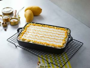 -Place bread slices in serving dish,add prepared mango custard,bread slices,prepared mango custard & spread evenly.