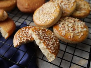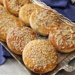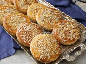 -Place tikiyan on greased baking tray,apply egg with the help of brush,sprinkle almonds & sesame seeds.