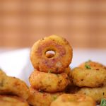 -With greased hands,take a small quantity of mixture (30g),make a ball & press a finger in the center to make a hole to create a donut like shape (makes 35).