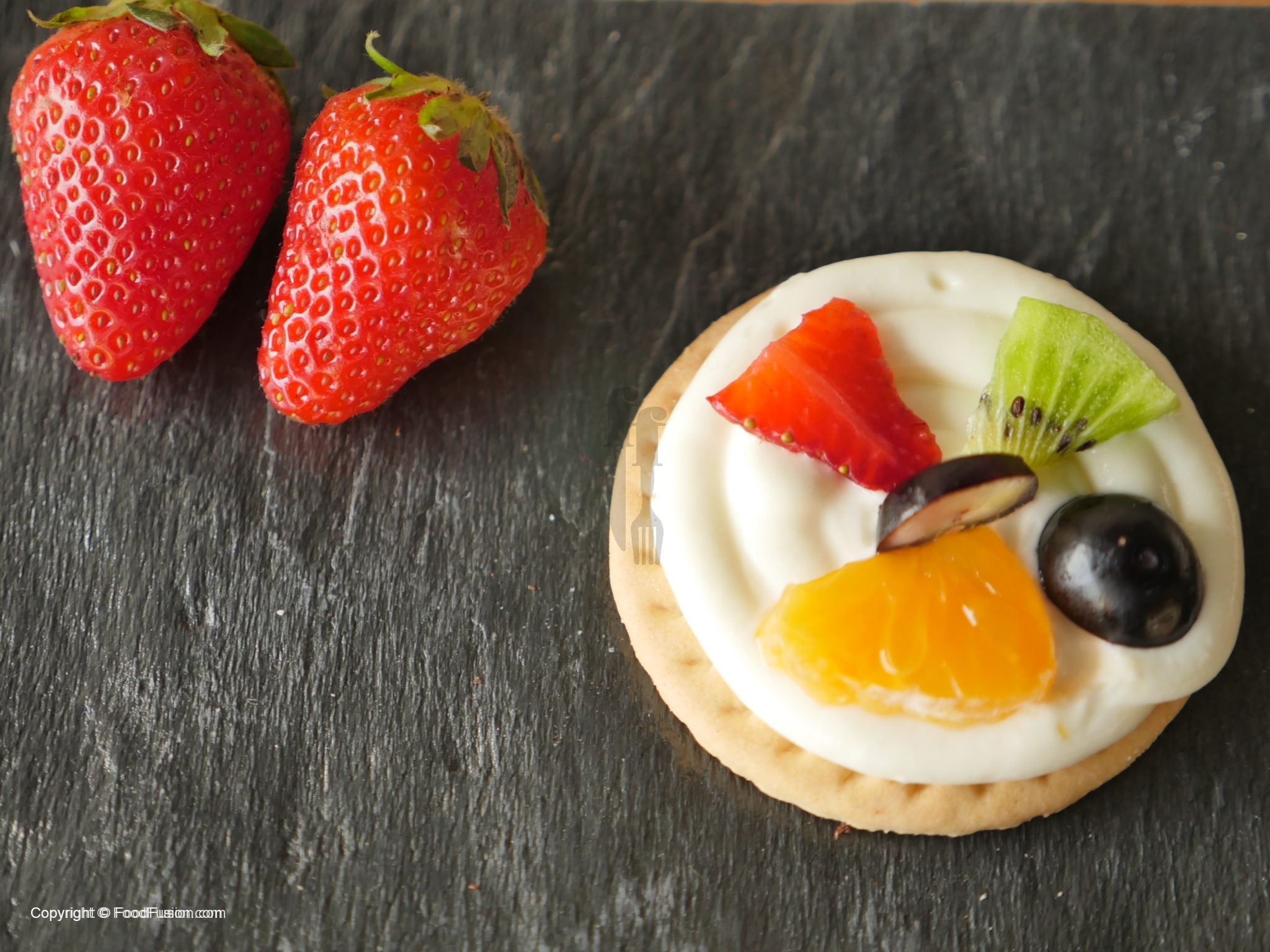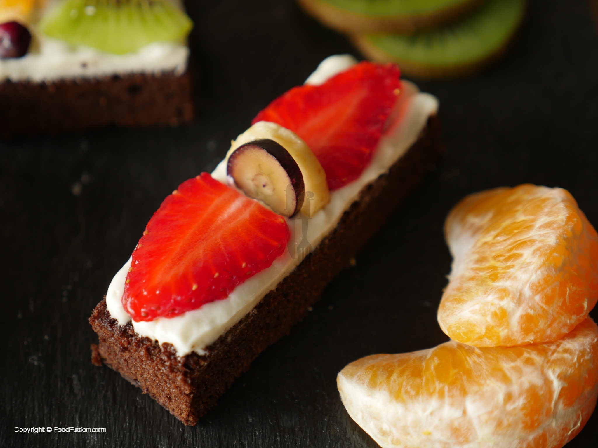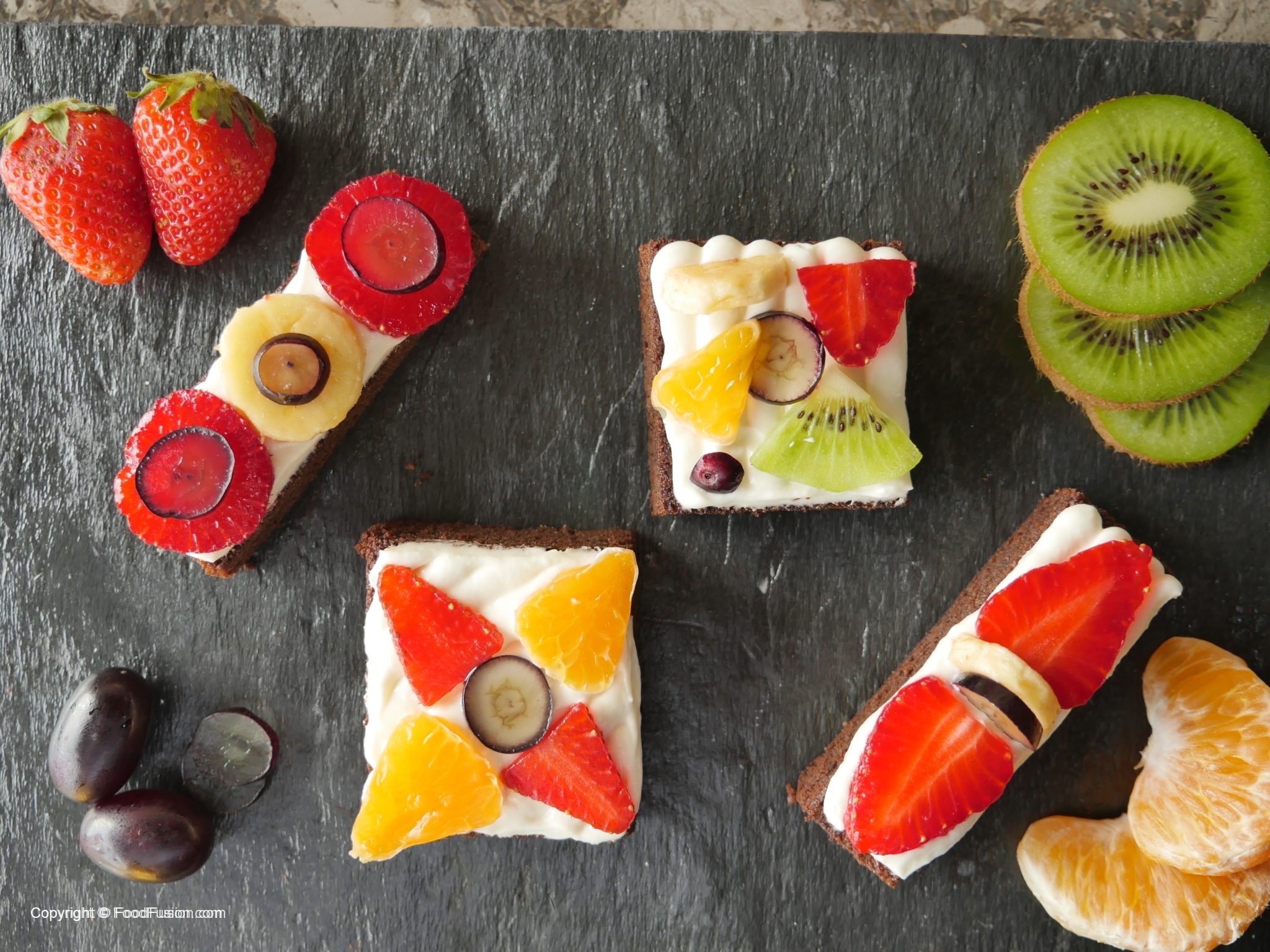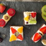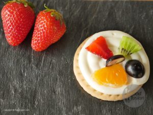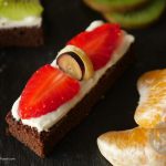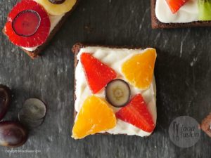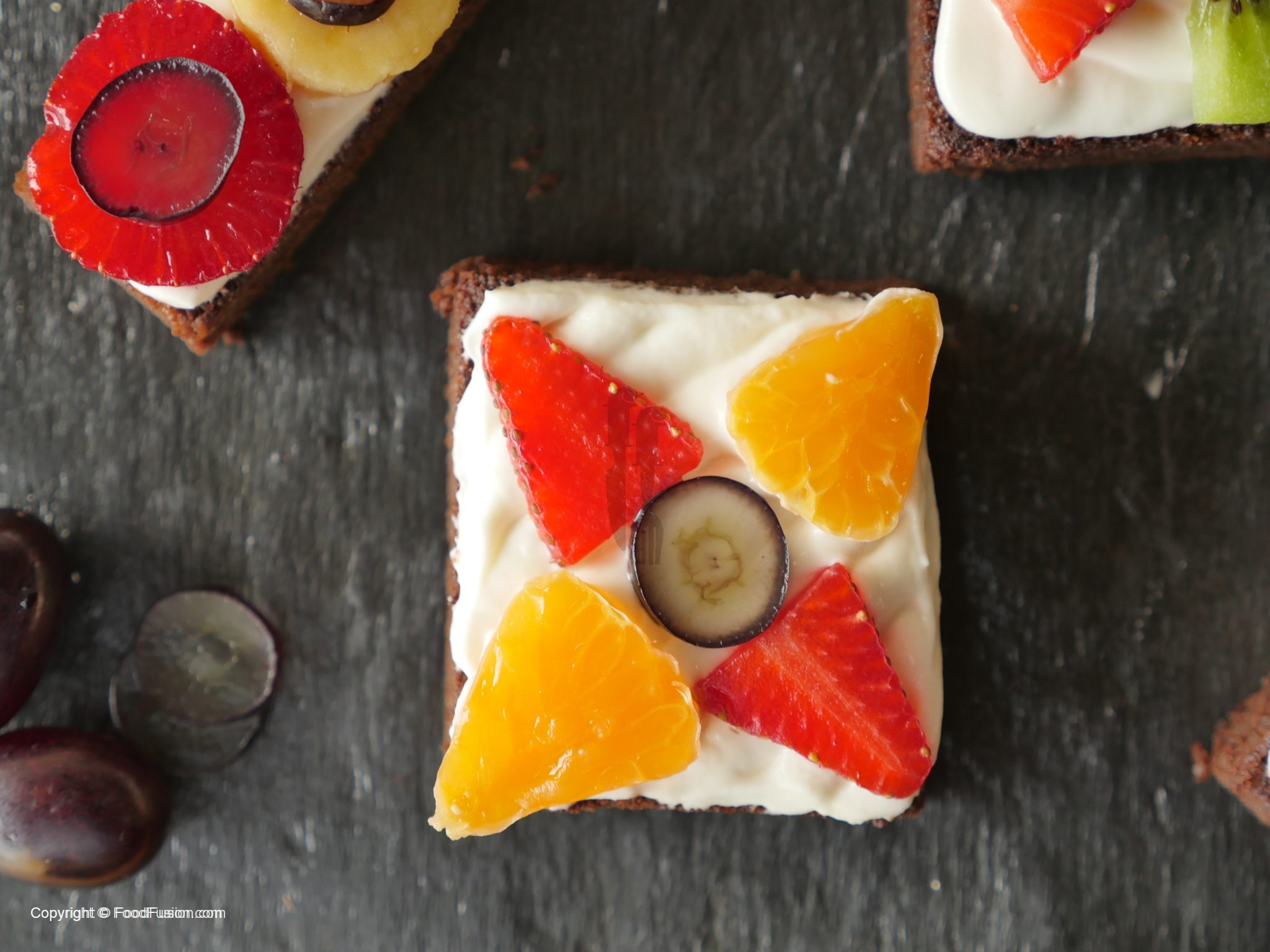 On cookies/brownies,spread a layer of frosting and garnish with colorful fruits and serve.