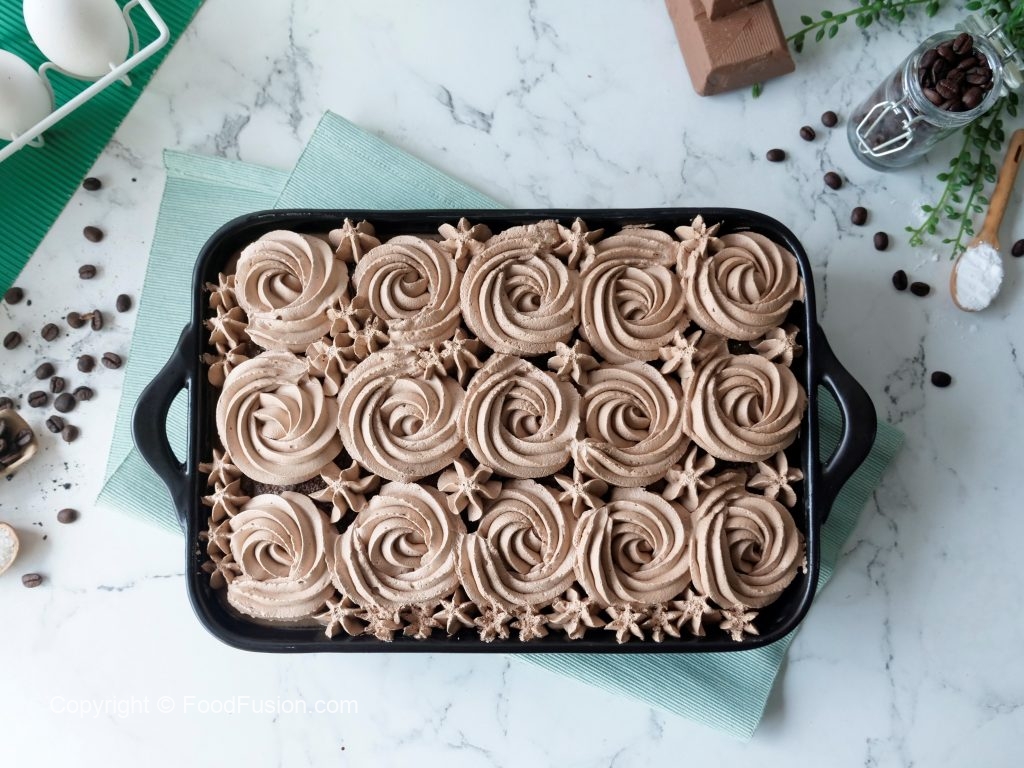 Poke the cake with the help of wooden skewer,pour prepared mocha milk over the top of the cake, filling holes,cover with cling film & refrigerate for 4 hours.