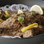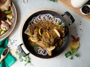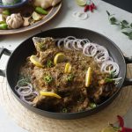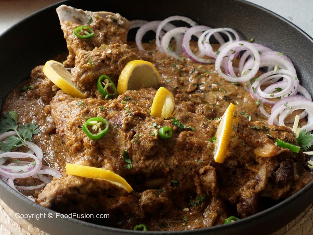 Add fried mutton leg/dasti & pour gravy,cover & cook on low flame until tender (1 & ½ hour ),rotate & flip in between.