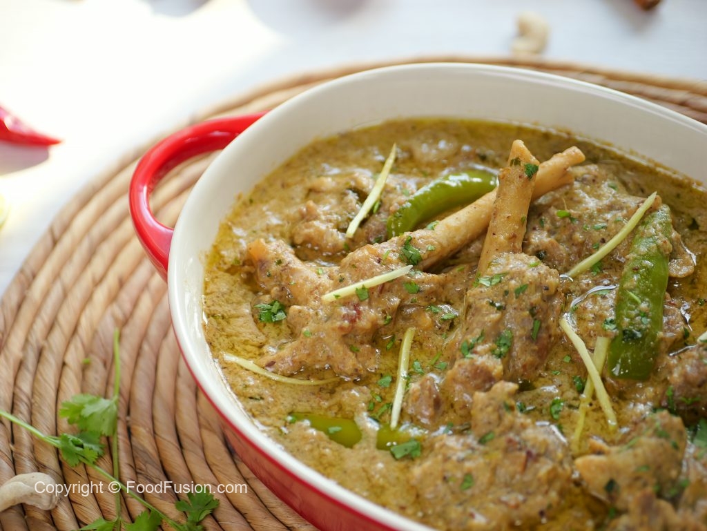 -In a saucepan,add onion,green chillies,green cardamom,mace,cashew nuts,water & mix well,cover & cook on low flame for 10-12 minutes.