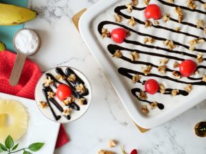 No Bake Banana Split Cake is Super Quick and always hit. Layers of Bananas topped over with the goodness of Olper’s Dairy cream make this dessert so decadent. #OlpersDairyCream #GoodnessBarhjaye #FoodFusion #olpers #HappyCookingToYou #Cake #Recipes
