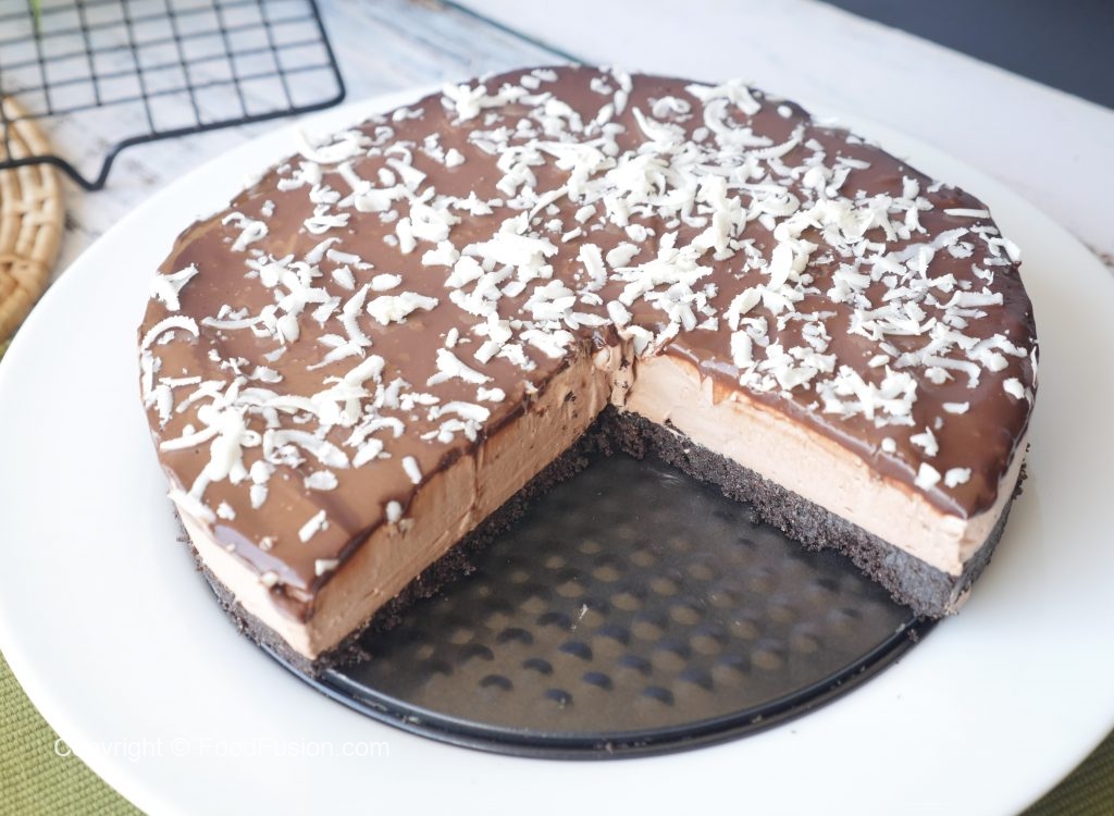 Grated white chocolate ko sprinkle kar k pan ko remove karden or Thanda serve karen.