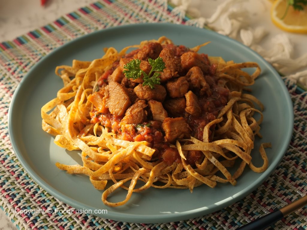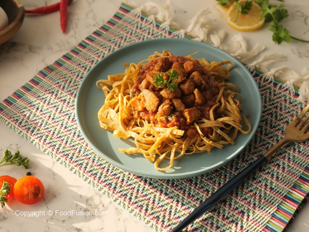-Serving plate mein tayyar egg noodles,marinara sauce aur cooked chicken dal ker serve karein!