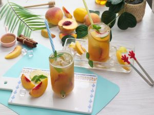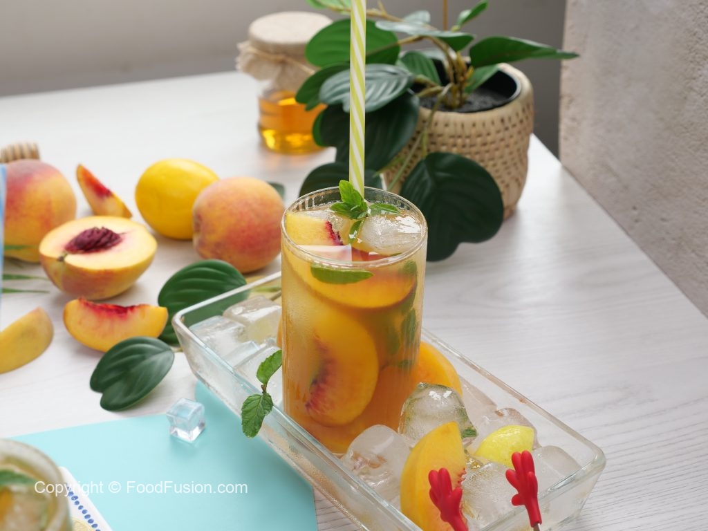 -In a serving glass,add ice cubes,peach slices,prepared green tea (3/4 cup),prepared peach mixture (1/4 cup),mint leaves & stir.