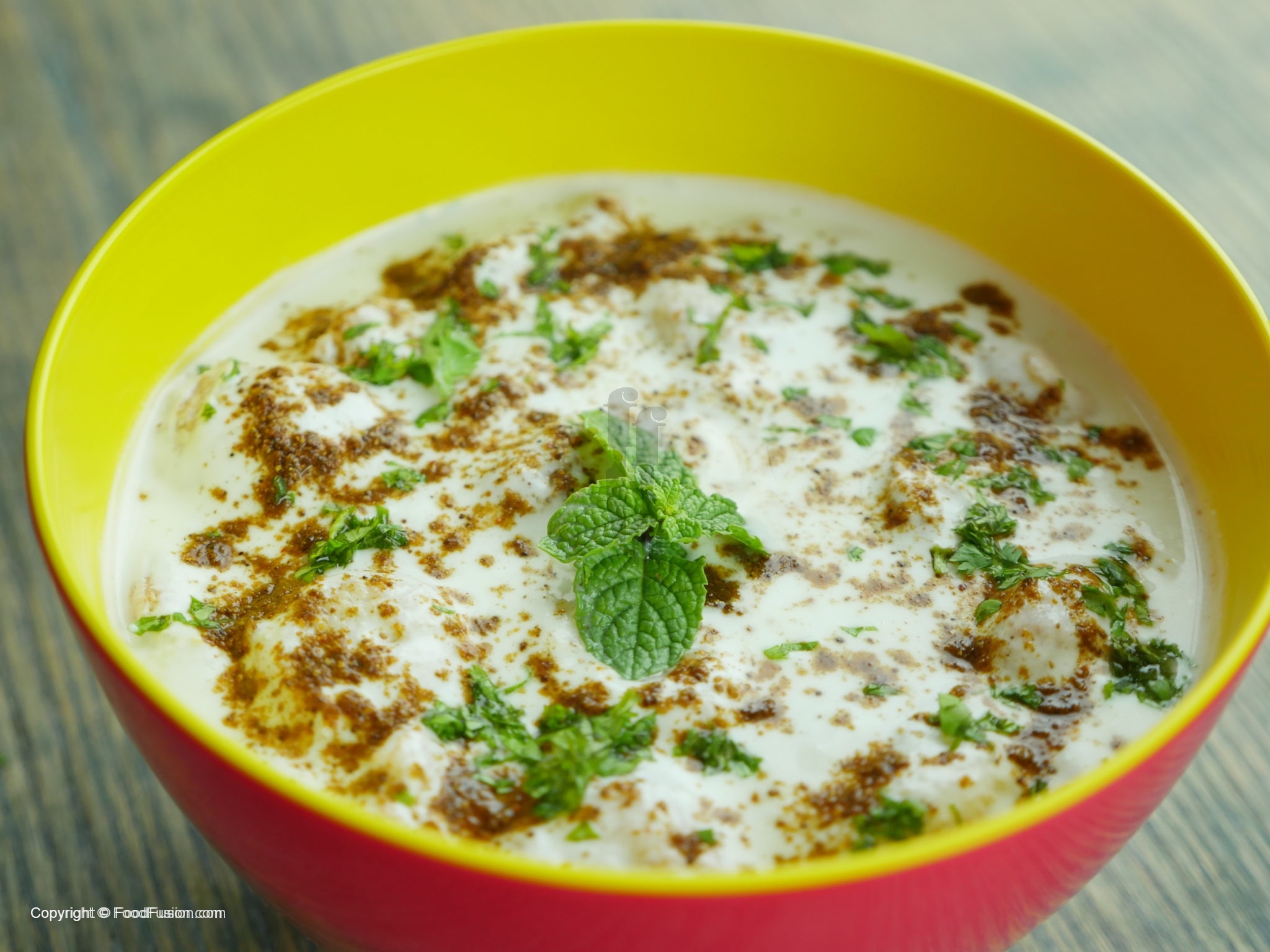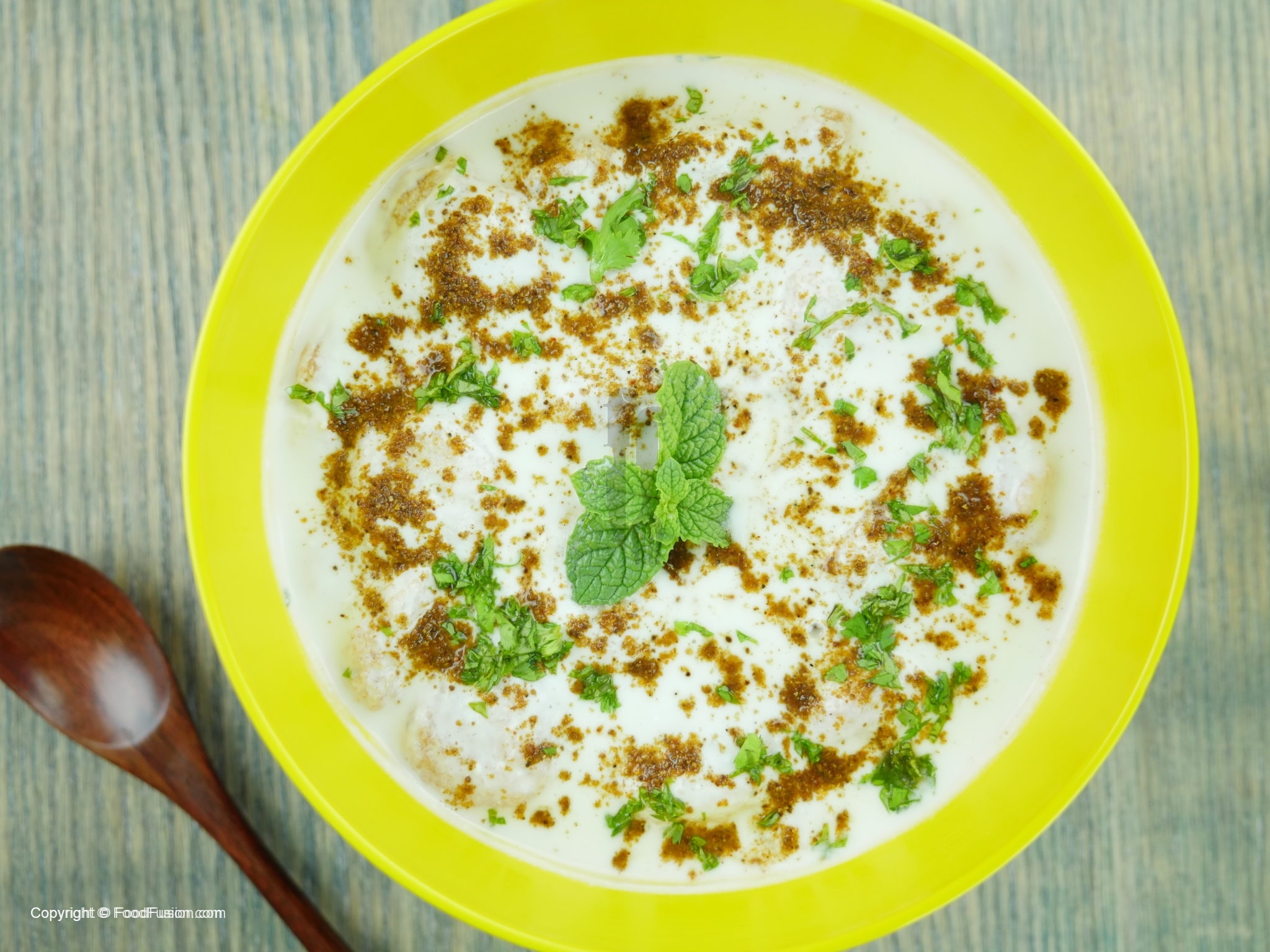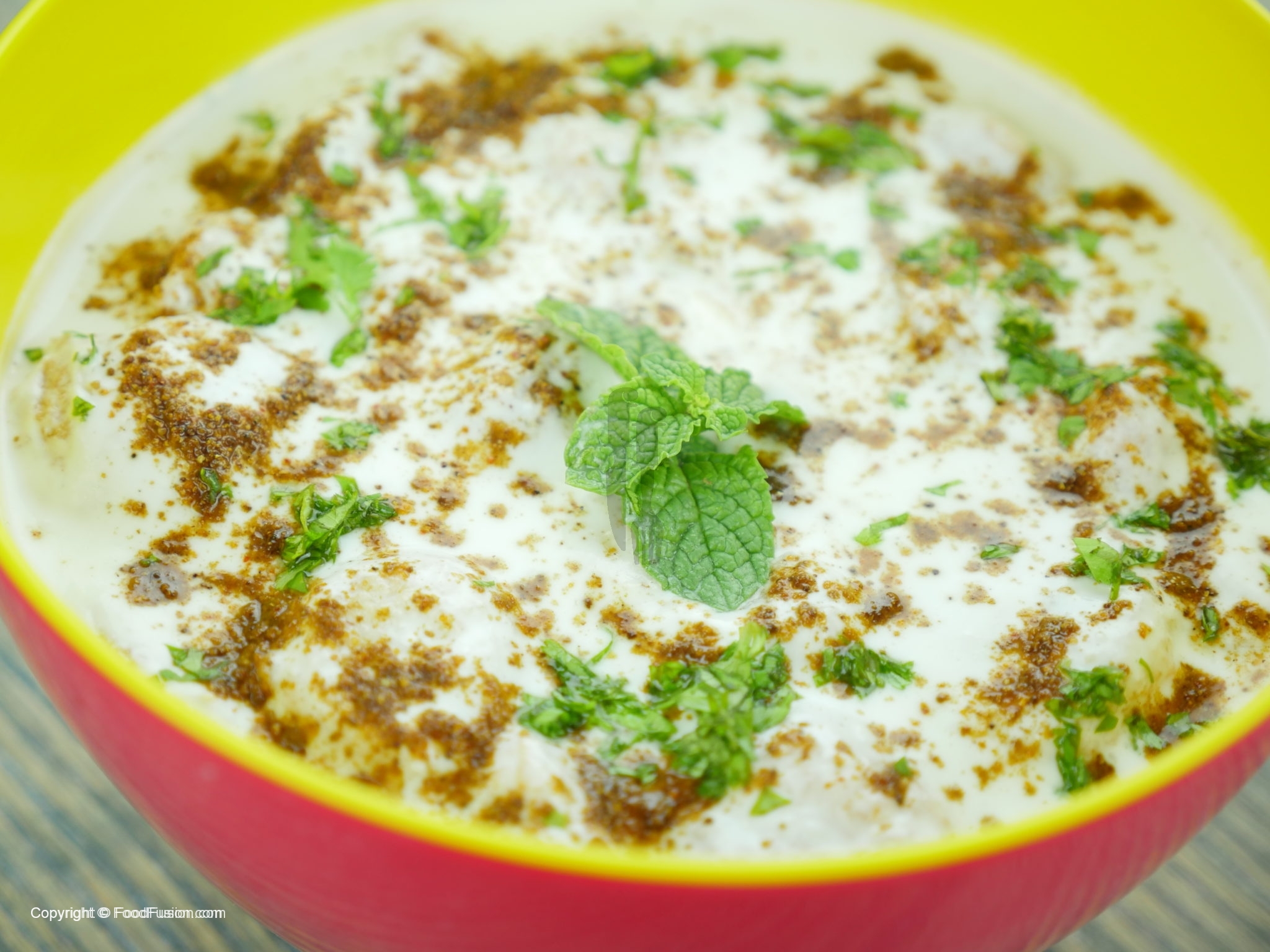 Ab bhalay pani main se nikal kar hath se press karke uska zaaid paani nikal len aur dahi nmain shamil karte jayen. Mix karlen aur chaat masala chirak dain.
