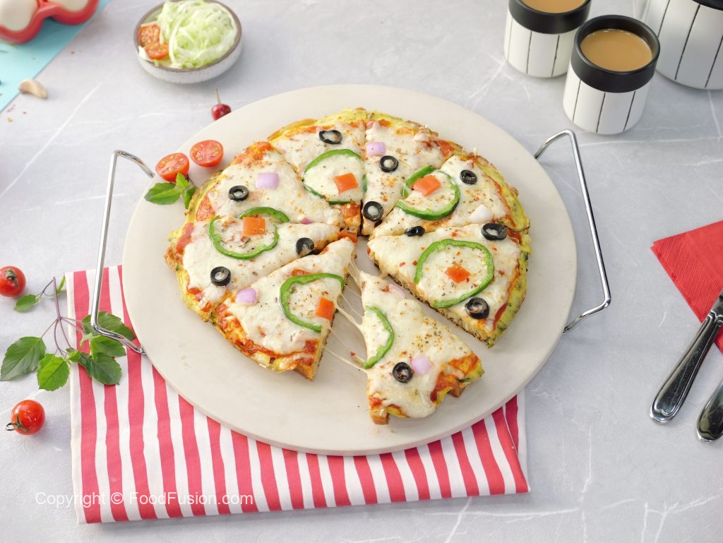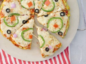 -Pizza sauce dal ker pheela lein,cheddar cheese,mozzarella cheese,shimla mirch,tamatar,pyaz aur black olives dal dein.