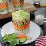 -In a mason jar,add prepared ranch dressing,cucumber,chickpeas,carrot,celery,cooked chicken, iceberg & cover with lid.