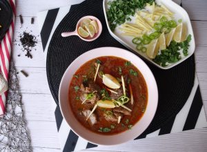 In serving dish,add nihari,cilli oil (tarri),ginger,green chilli,fresh coriander,lemon & serve!
