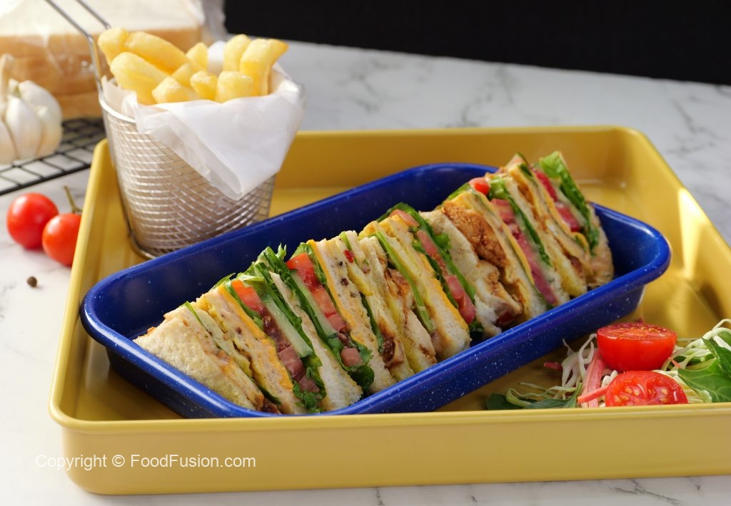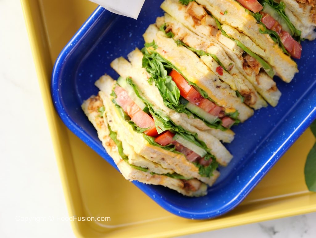 -On one toasted bread slice,add & spread prepared spicy mayo sauce,add prepared grilled chicken slices & prepared egg omelette.