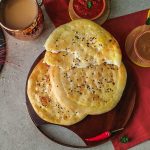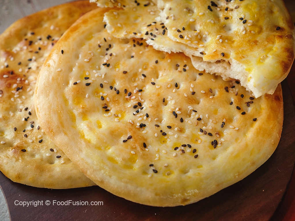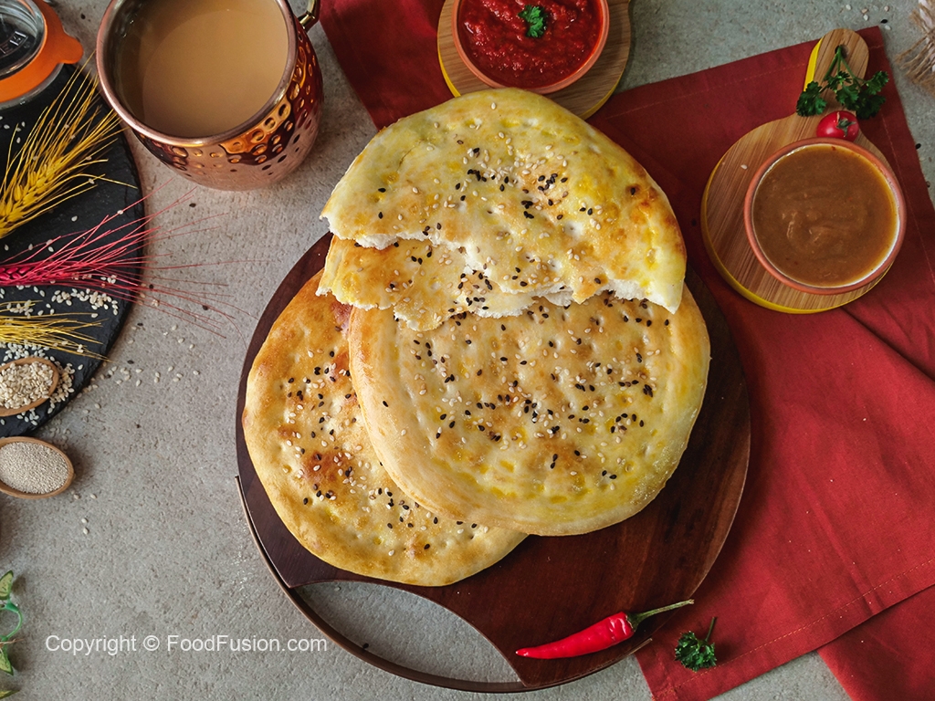 Brush ki madad sa naan per laga lein aur kalay & safed til chirak dein (makes 4).