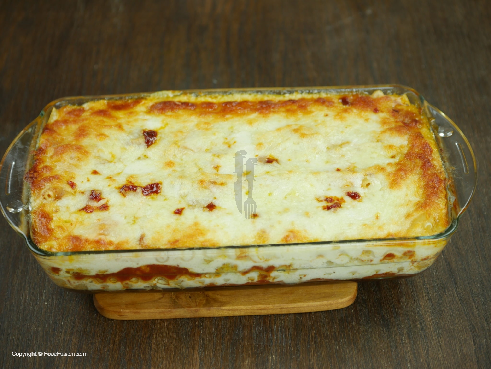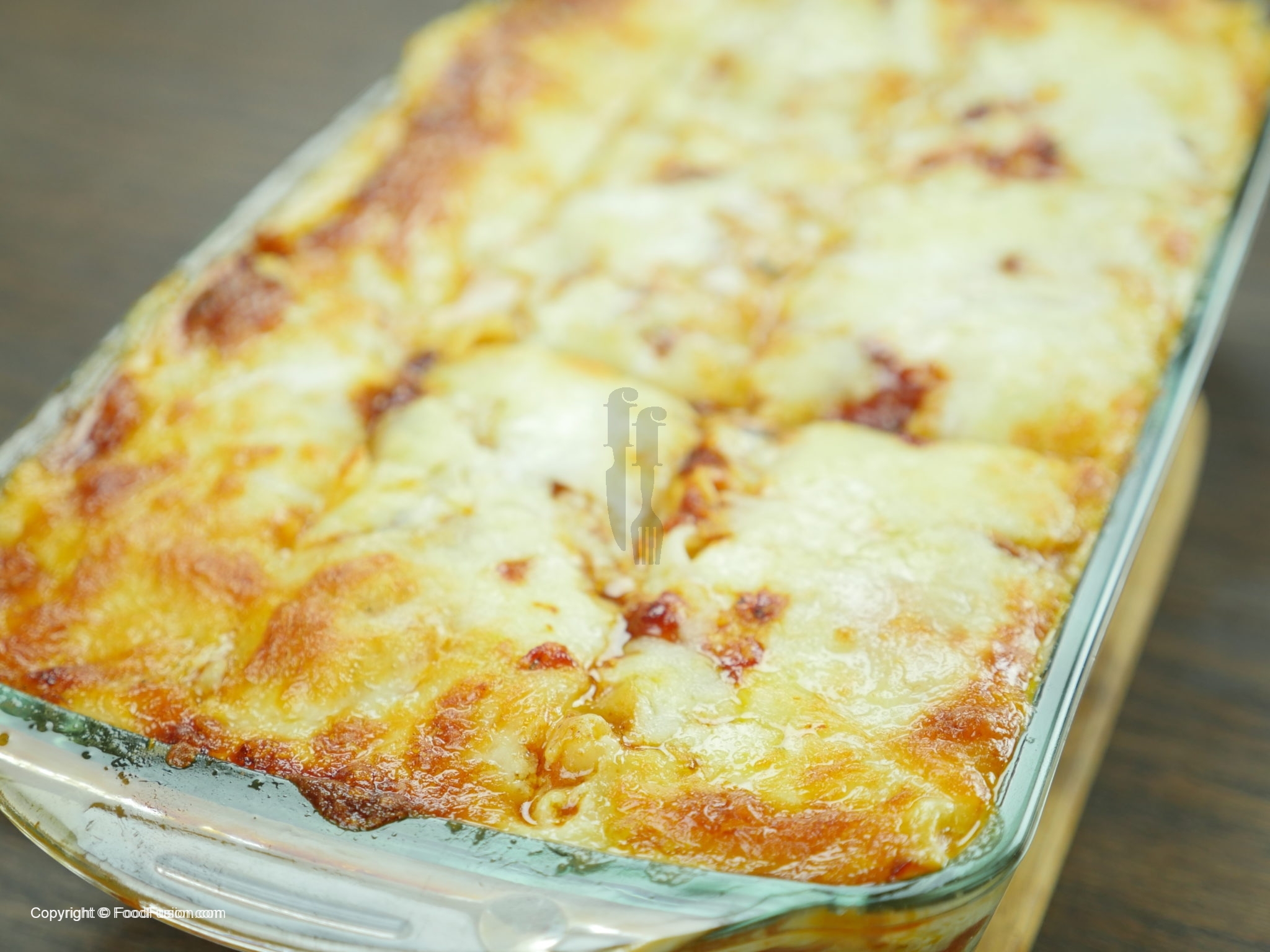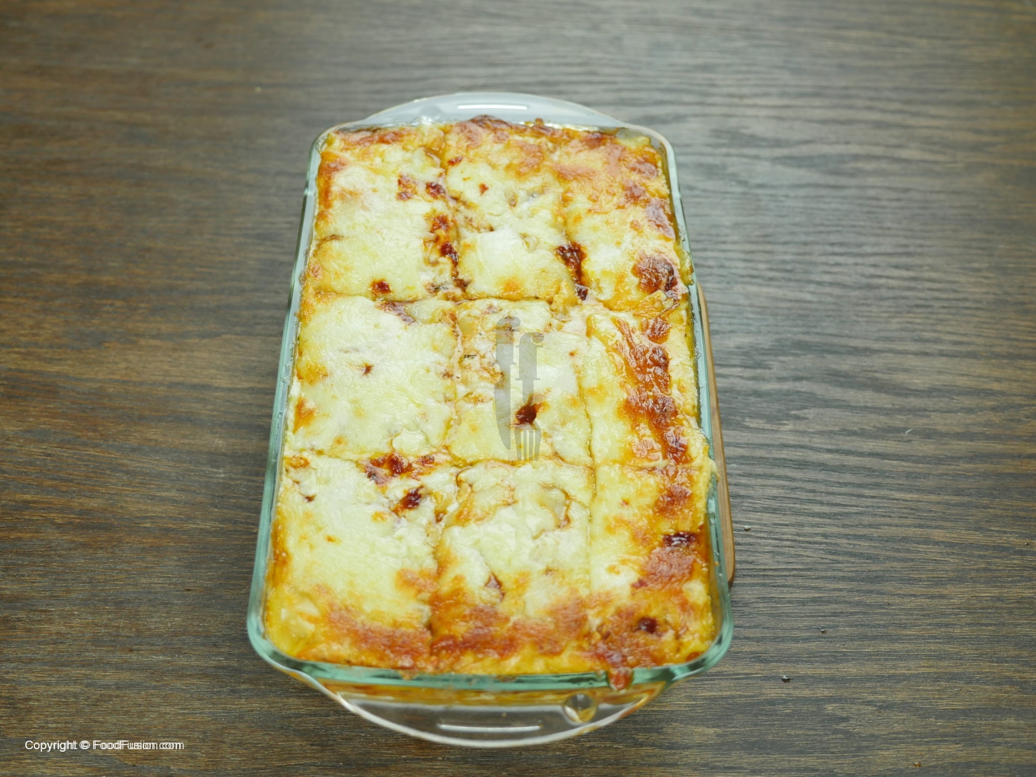Jaisa he mozzarella ki crust sunhairi ho jaye oven ko bund ker dein.Baking dish ko oven sa bahir nikal ker square shape mein cut ker k serve karein.