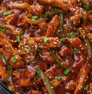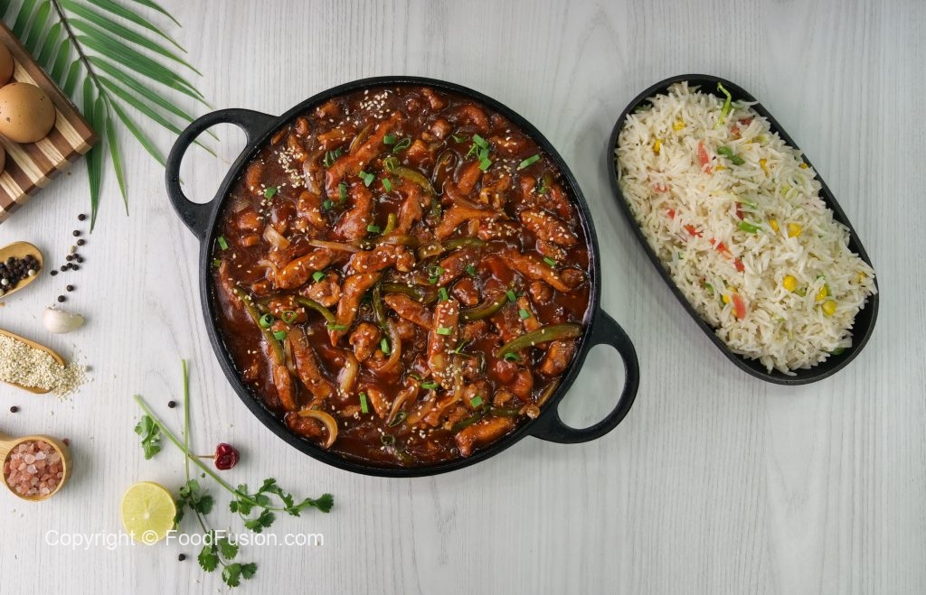 -Heat sizzling pan,pour chicken & garnish with sesame seeds,spring onion & serve with fried rice.