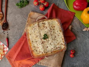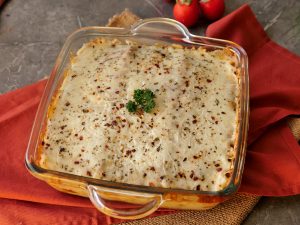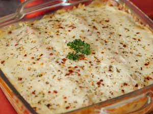 Lasagna sheets,red sauce,smoky chicken,white sauce,lasagna sheets,red sauce,cheddar cheese,mozzarella cheese dal dein,dried oregano aur lal mirch crushed chirak dein.