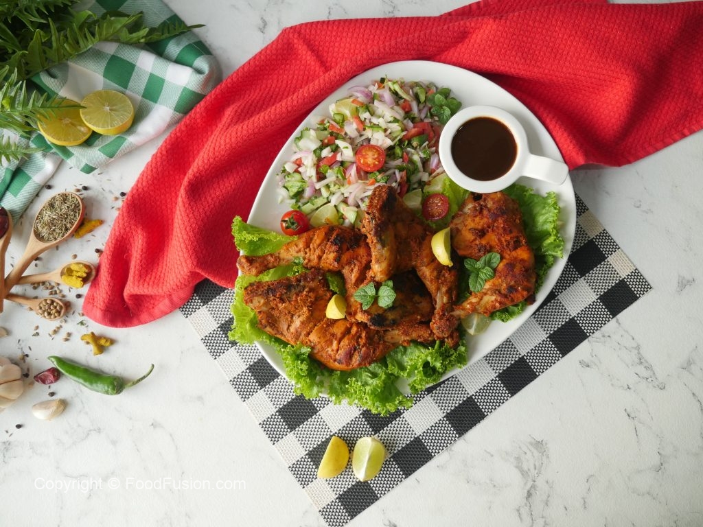 Smoky tandoori chicken ko salad or imli k sauce k sath serve karein.