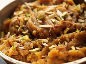 Add ghee (2 tbs at a time),mix well & cook on low flame until it changes color (12-15 minutes) and mix continuously.