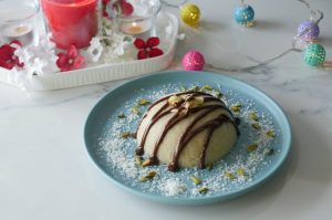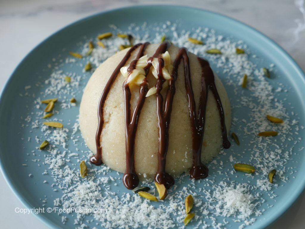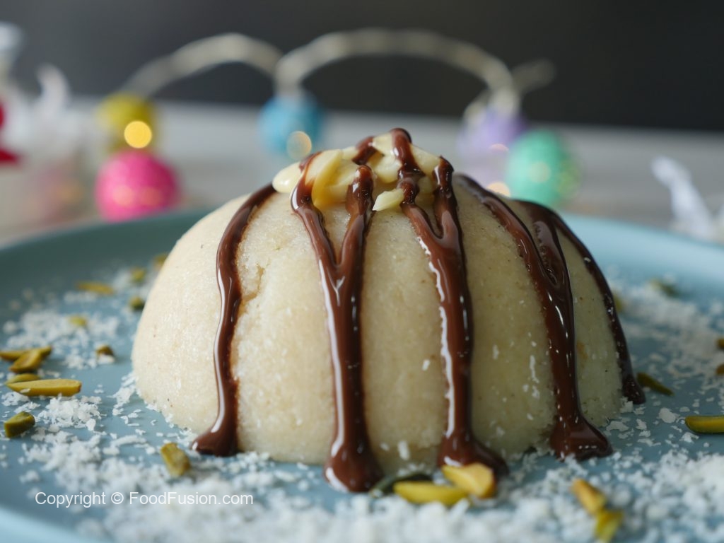 Add a scoop of king kulfa and cover with semolina halwa then flip on serving plate and garnish with desiccated coconut,pistachios,fried almonds,chocolate sauce & serve!