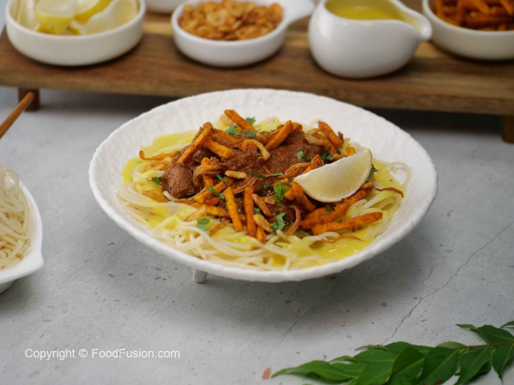 -In a serving plate,add spaghetti,prepared curry,beef currry,chips,fried garlic,fried onion,fresh coriander, lemon juice,chaat masala,lemon & serve!