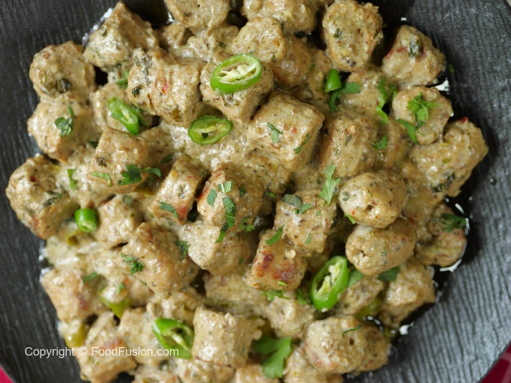-In a large griddle,add cooking oil & fry steamed cooked kababs (10 kababs) on medium flame from all sides until golden than cut all the kababs in 1-inch pieces & cook for a minute.