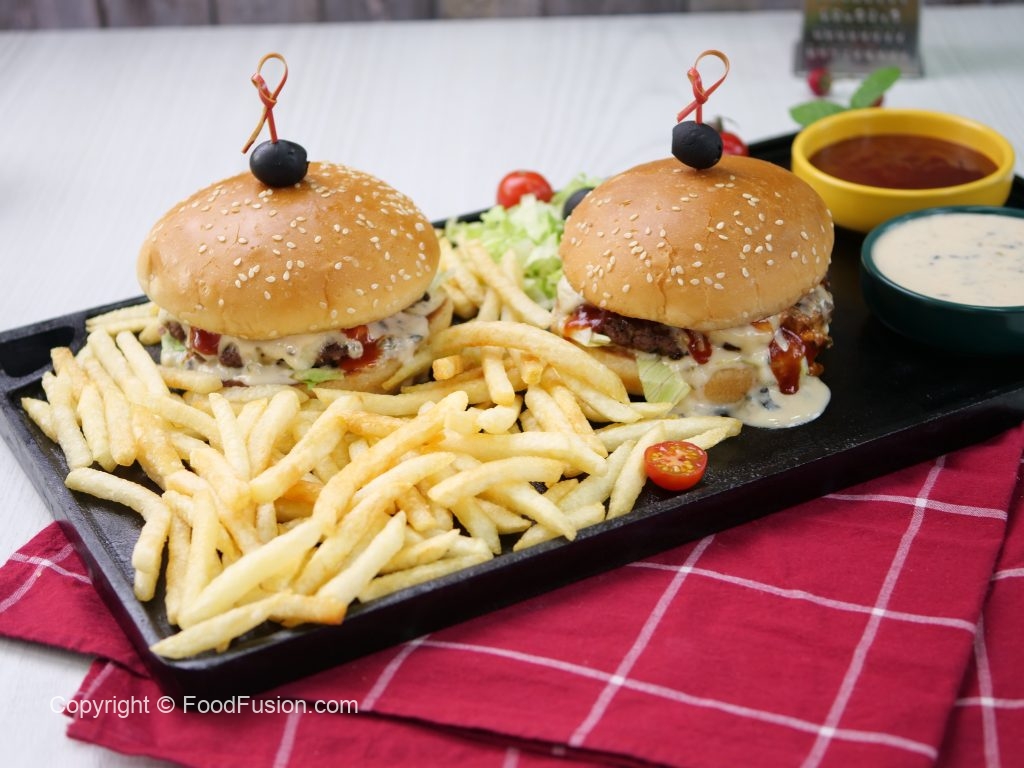 -Toasted burger bun per tayyar cheese sauce,iceberg,cooked beef patty with cheese,cheese sauce aur tomato ketchup dal ker upper sa burger bun rakh dein (makes 5).