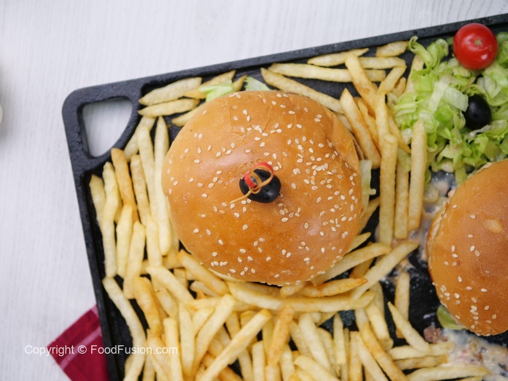 -On griddle,add cooking oil & place burger patty meatball,press it with the help of patty press, remove butter paper & sprinkle prepared spice mix & cook on low flame for 3 minutes than flip,sprinkle prepared spice mix,place cheddar cheese slice,cover & cook on low flame for 1-2 minutes.