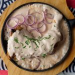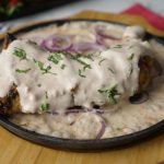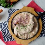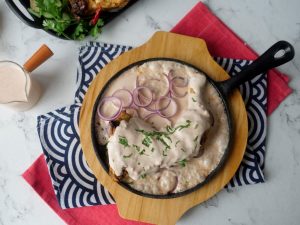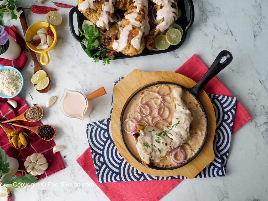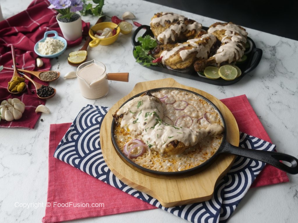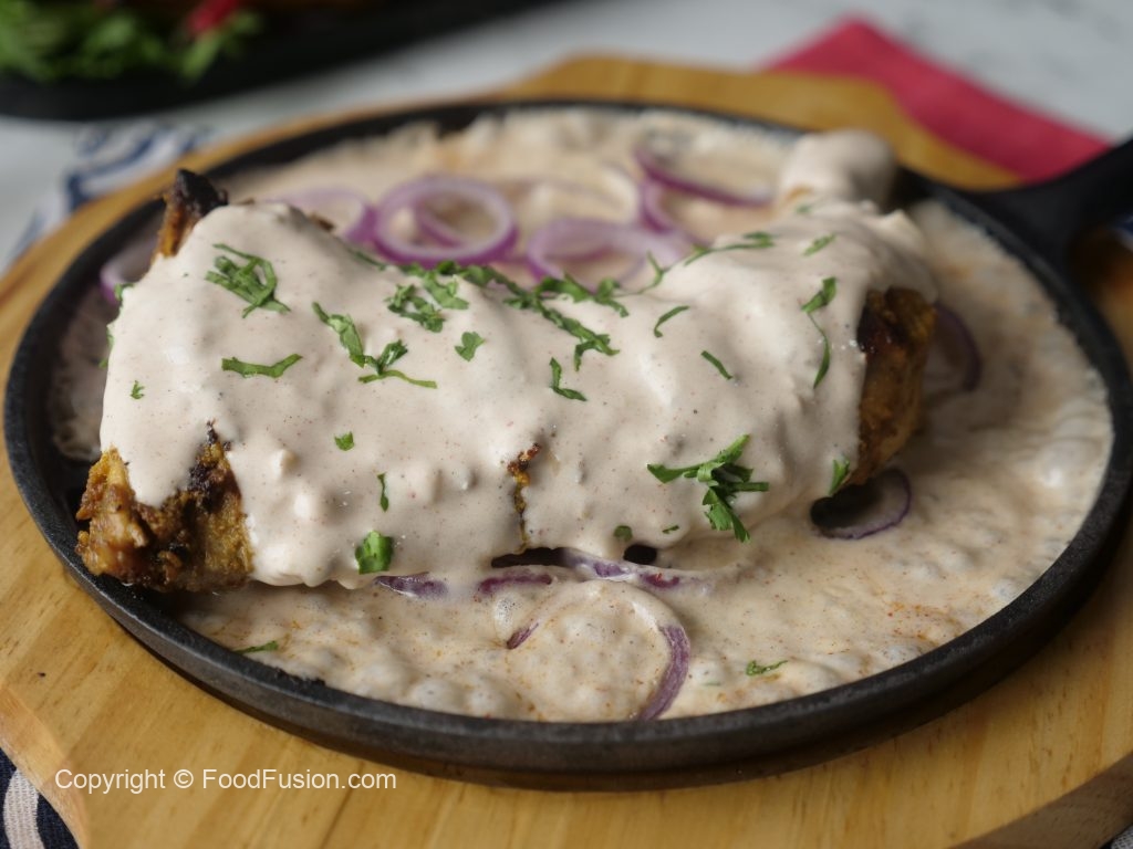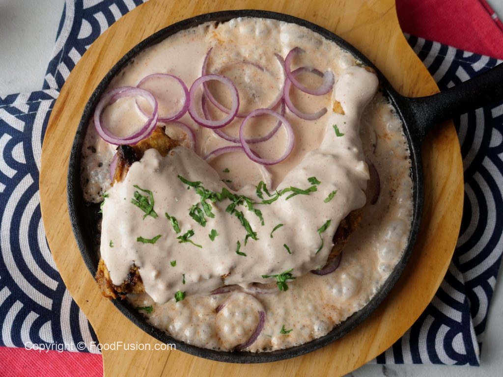 Heat cast iron pan,place onion rings,chicken tikka piece and pour prepared cream & cheese sauce.